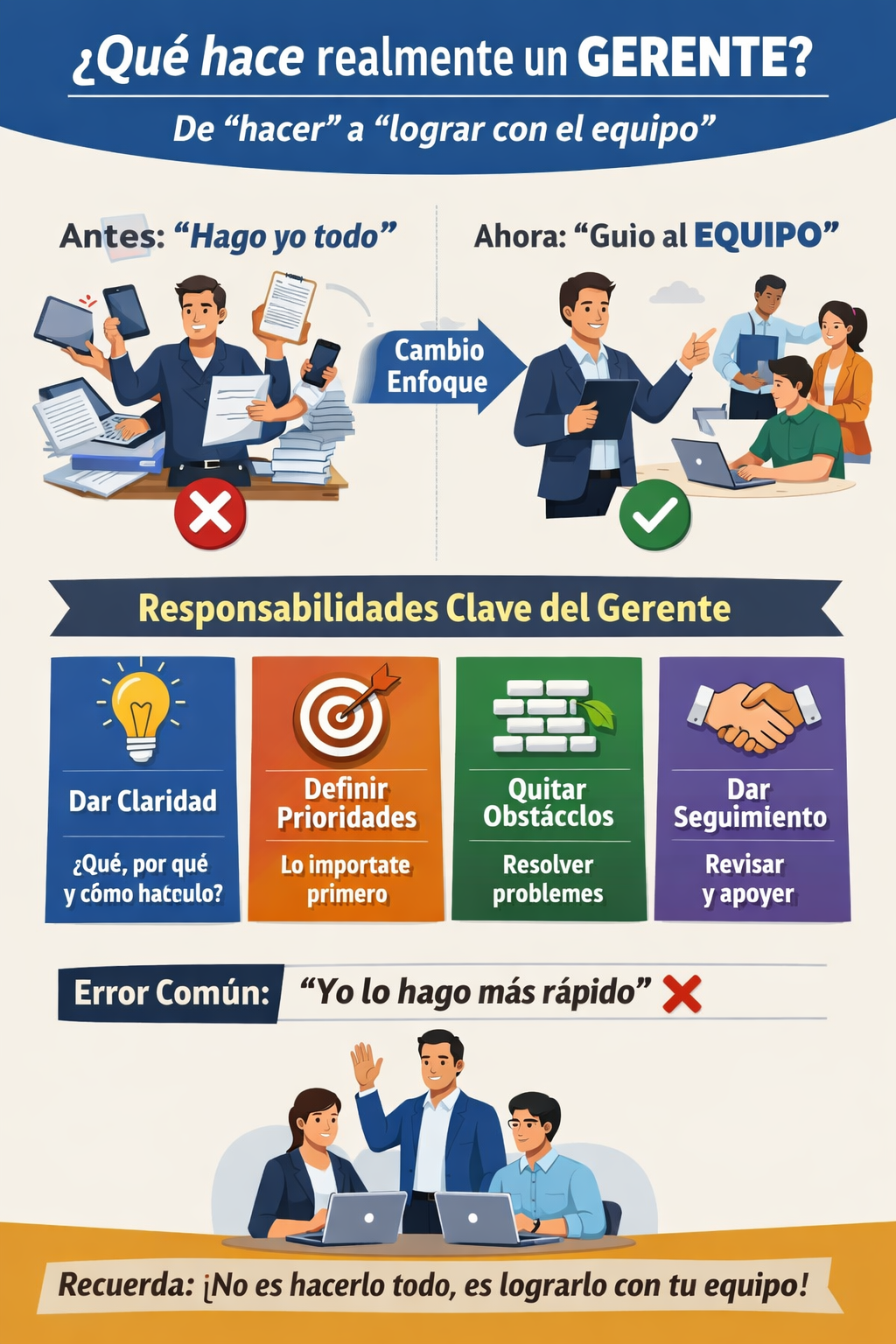 Un gerente no es la persona que hace todo. Un gerente es quien hace que el trabajo suceda a través del equipo: define el rumbo, organiza, apoya y da seguimiento para que el resultado se logre a tiempo y con calidad.
